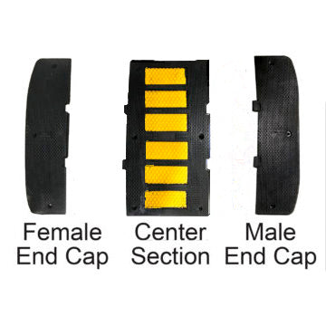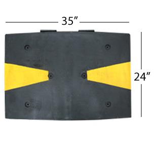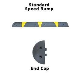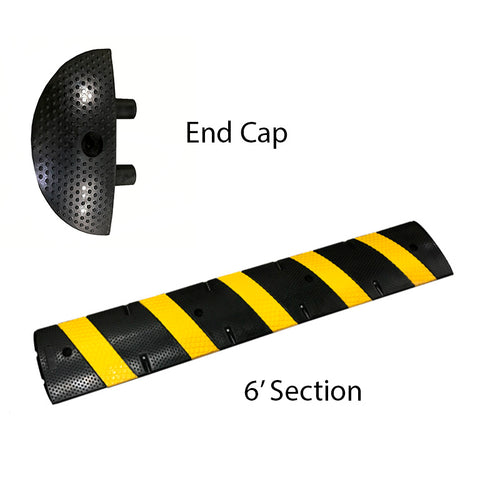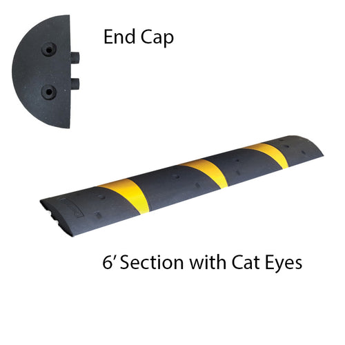 The Standard Speed Bump is a traffic control device designed to provide safety to pedestrians, workers and vehicles in any heavy traffic area, parking lot or property, composed of durable molded 100% post-consumer recycled rubber with a polyurethane binder, resistant to weather, oil, salt, moisture, UV light, and high temperatures that will not warp, chip, or crack. Made with molded-in rubber EPDM yellow stripers, that won't degrade and need no maintenance unlike traditional painted stripes making it long lasting, and Cat Eye Reflectors that provide visibility during the day and night time which are distributed across the 6' and 4' section.