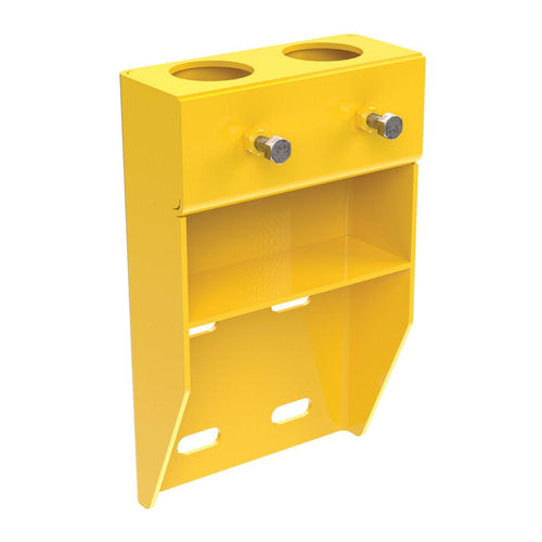 Steel Wall Mount Bracket for Pipe Safety Railing Dual Pocket , Yellow | The Steel Dual Pocket Wall Mount Bracket is designed to securely anchor two parallel safety rail pipes to walls or structural surfaces. Ideal for terminating or extending railing systems, this bracket ensures a robust connection and helps maintain alignment in high-traffic or industrial environments.