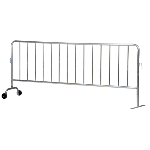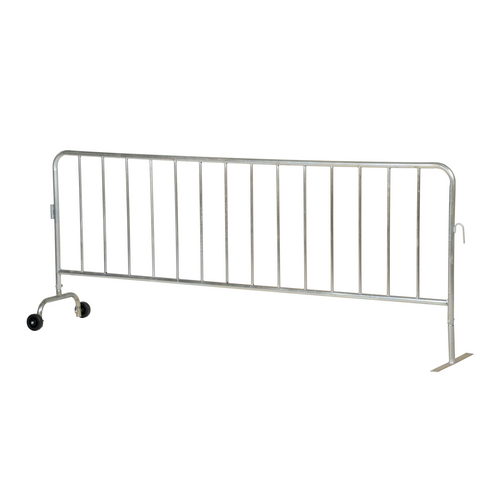 Steel Heavy Duty Crowd Control Interlocking Barrier with Wheeled Feet 101-3/4 In. , Silver | The Steel Heavy-Duty Crowd Control Interlocking Barrier is a robust, long-lasting solution for managing crowds and delineating spaces in high-traffic environments. Designed for industrial and commercial use, this barrier features an interlocking system that allows for seamless connection of multiple units, making it ideal for controlling access, guiding foot traffic, or establishing secure perimeters at events or job sites.