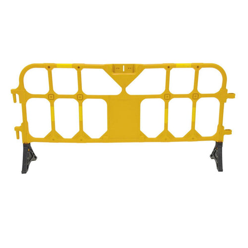 Steel Heavy Duty Crowd Control Interlocking Barrier with Curved Feet 101-3/4 In. , Yellow | The Steel Heavy-Duty Crowd Control Interlocking Barrier is a robust, long-lasting solution for managing crowds and delineating spaces in high-traffic environments. Designed for industrial and commercial use, this barrier features an interlocking system that allows for seamless connection of multiple units, making it ideal for controlling access, guiding foot traffic, or establishing secure perimeters at events or job sites.