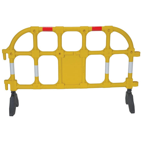 Steel Heavy Duty Crowd Control Interlocking Barrier with Wheeled Feet 101-3/4 In. , Yellow | The Steel Heavy-Duty Crowd Control Interlocking Barrier is a robust, long-lasting solution for managing crowds and delineating spaces in high-traffic environments. Designed for industrial and commercial use, this barrier features an interlocking system that allows for seamless connection of multiple units, making it ideal for controlling access, guiding foot traffic, or establishing secure perimeters at events or job sites.