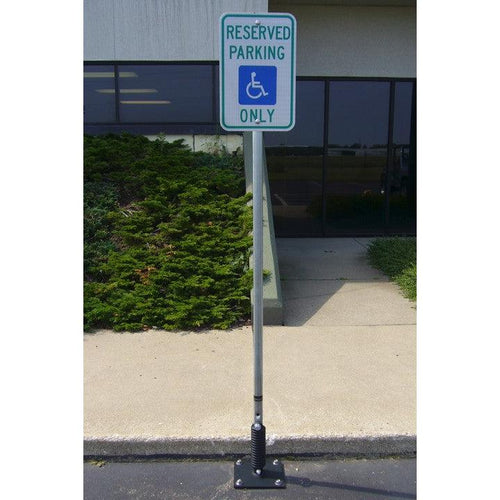 Our 6' Standard Sign Post System for Asphalt Installation's main feature is to minimize damage to vehicles and parking surfaces and also provide safety to parking areas with the regulatory signs that our 6’ Sign Post can handle. Its durable construction endures abuse, wear, tear and can withstand high-speed impacts with a 360° degree range of motion. Its installation takes a few minutes and no special tools are required.