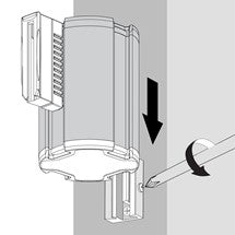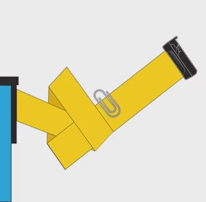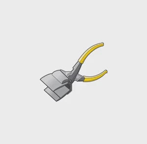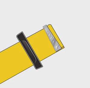 | Pull enough Belt Ribbon out from post to make a loose knot. This will keep it from retracting back into the unit and will make it easier to work with. Take note of the top edge of the Belt Ribbon and place a paper clip to mark the top. | Cut off the old Belt End and thread the Belt End Back piece onto the belt ribbon. Double-check that the radius corner and the belt ribbon are oriented to “TOP”. The radius corner should also be facing the unit. | Position Wedge in Crimping Tool so that the back edge sits against the screws. Feed the belt ribbon into the Wedge, making sure it is centered and fully seated to the back of the Wedge. Apply pressure with the Crimping Tool to secure. | Fold Ribbon/Wedge over and fit it snugly into the Belt End Back piece. Secure the Belt End Front piece to the Belt End Back piece using the 2 provided screws (there is only one way it will fit). Untie the knot and retract the belt to complete installation. |