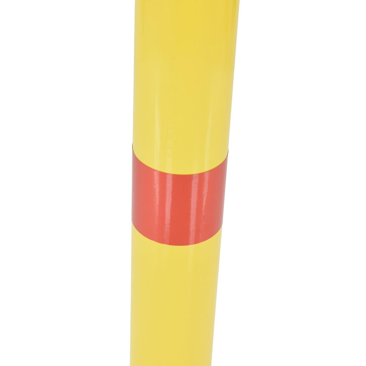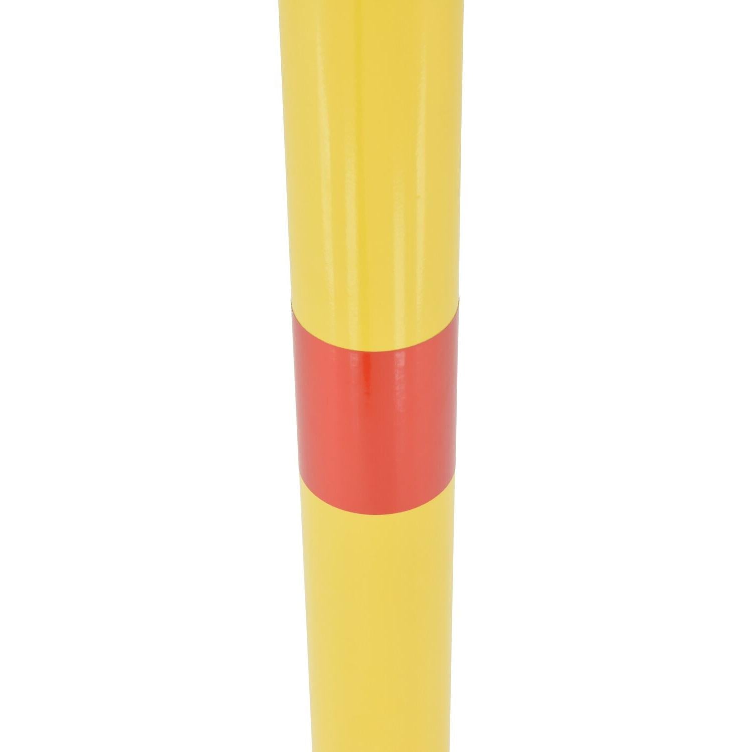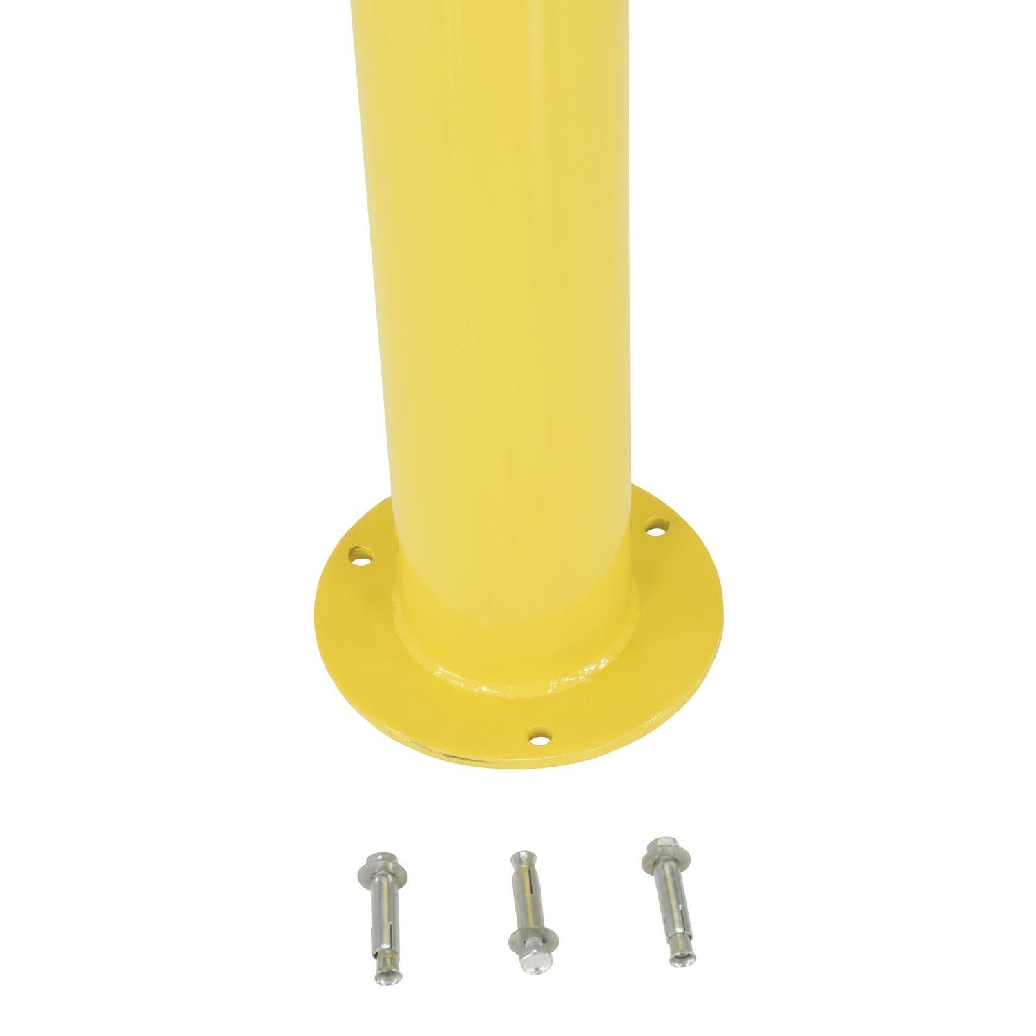 Each bollard is constructed from heavy-duty steel with a durable yellow powder-coated finish that resists UV damage and harsh conditions. The top-mounted eyelet allows for the addition of chains or ropes to form barrier systems. Reflective bands are included for increased visibility, and mounting hardware is provided for straightforward installation.