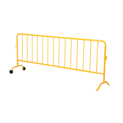 Constructed from rugged welded steel, this barrier provides long-lasting performance and reliability. It measures 102" L x 40" H and features removable feet, allowing the unit to lay flat for compact shipping and storage. Vertical bar spacing ensures safety and visibility, while integrated connectors allow multiple units to link together to form continuous runs.